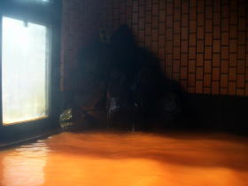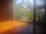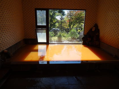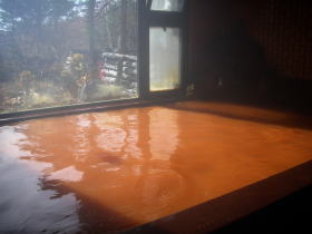 300メートルほど離れた源泉から空気に触れないように引き湯し、42℃に沸かして使用しています。湯口では無色透明なのですが、湯舟で空気に触れて酸化されることによってこのような赤褐色になります。舐めてみると強烈な鉄分を感じる味でした。 |