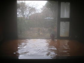 | 湯舟は男女別に内湯が1つずつですが、大きな窓からはそとの景色が見え、ゆったりした気分で浸かれます。実によく温まる湯で、数分浸かっただけで体が芯から温まりました。 |