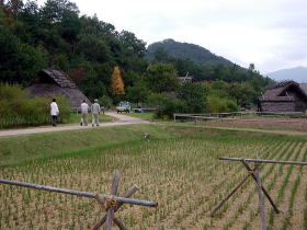 (千曲市):古墳時代のムラが復原され、茅葺きの家や倉庫など8棟の建