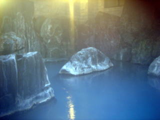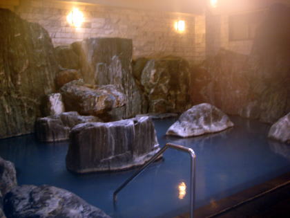 玄関や脱衣所はごく普通の日帰り入浴施設ですが、浴場のドアを開けてびっくり。巨石を配した湯舟に青い湯が溢れています。仙人でも入っていそうな神秘的な雰囲気。