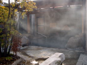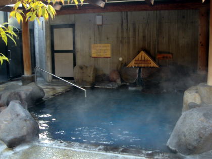 硫黄泉は白濁していたり、緑がかったり、その湯その湯で様々ですが、ここの湯は笹濁りの青。日によって変わるのかもしれません。 |