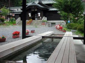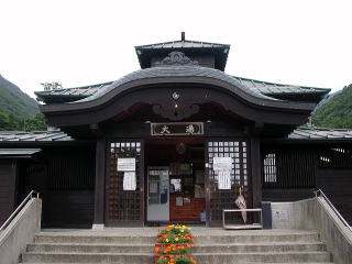共同浴場の大湯はそのシンボル的な存在。入母屋・唐破風を持つ桃山風の湯屋建築は温泉情緒満点である。 |