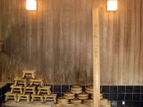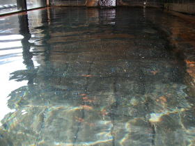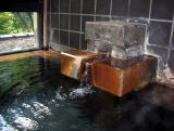 | 「元湯」と「わなば」の混合泉。無加水の源泉かけ流しのため、かなりの高温です。湯口から一番遠い、湯がオーバーフローしている付近でも43℃くらいあるのではないでしょうか。シャキッした気持のよい湯です。 |