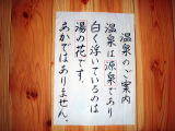 | 脱衣所に上の張り紙がありましたが、左の写真でもわかるように、あまり温泉に入りなれていない人が誤解するのも無理なかろうとも思われるほど湯の花が浮遊しています。すごいです! |