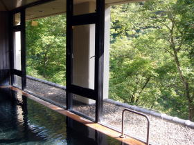 | 共同浴場「大湯」を思わせる堂々たる大浴場です。渓谷に面した窓は大きく開放的。絵になる風呂、本当に美しい! こういう内湯には何度も足を運びたくなります。 |