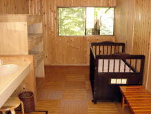 洗い場は入浴前に体を流すためだけの簡易的なもの。スペースが狭く、滑ると危ないので石鹸やシャンプーは使用できません。 |