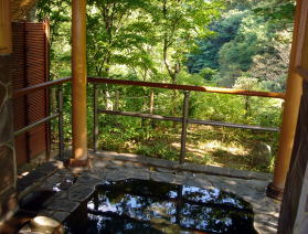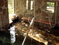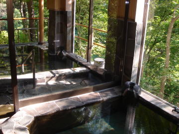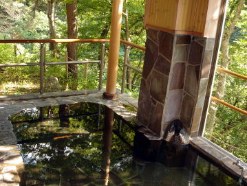 | 源泉かけ流しの湯舟が2つ。。松川渓谷に面していて、緑が飛び込んできそう。このあたりにはニホンカモシカが生息していて、この露天風呂のすぐ近くまで来ることもあるそうです。 |