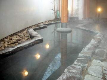 お湯はすべての湯舟がかけ流し。高温のため加水はしていますが、注入される湯量は豊富で温泉の匂いが漂い、気持ちいい。内湯には信州らしく、リンゴが浮かべられていました。 |
