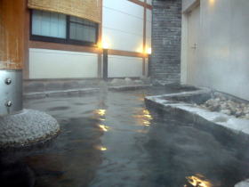 | 駅のホームと駅前広場の間のウナギの寝床のような敷地のため、眺望ゼロの露天風呂ですが、デザインが良いせいでしょう。温泉の川に入っているようで、なかなかいい雰囲気です。 |