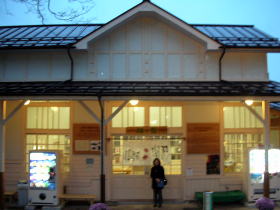 | 「楓の館」は長野電鉄湯田中駅旧駅舎(1927年開業)。志賀高原の玄関口として親しまれてきたが、昭和31年に上野・長野間の急行列車が乗り入れることにより、反対側の駅舎に利用が移る。2003年の「楓の湯」開湯に併せて「楓の館」としてリニューアルされ、国の有形文化財にも登録。地域住民の交流の場や展示室として活用されている。 |