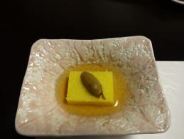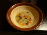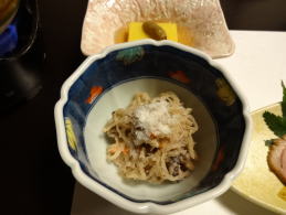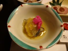 | 先付: トウモロコシ擦り流し 糸瓜くるみ和え |