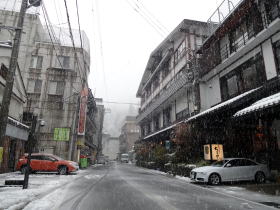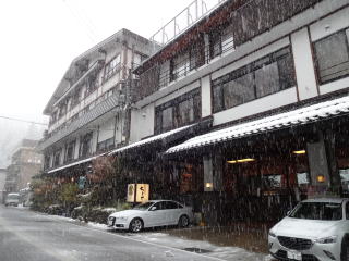 | 今回は国際バラとガーデニングショウ最優秀賞の副賞(選べるカタログ)で、ぶらり日帰りプラン(温泉+昼食+ゆっくり休める個室)を利用しました。11月中旬、松之山の温泉街は雪化粧です。 |