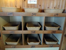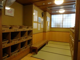 畳敷きのきれいな脱衣所。籠にはそれぞれ格言や四字熟語が付いています。 |
