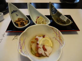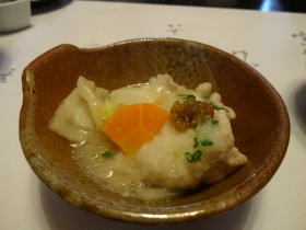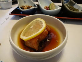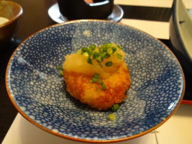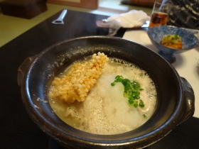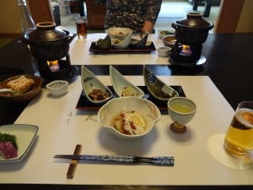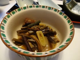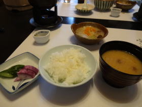 | ワラビ、鯉の旨煮、食用菊「もってのほか」、そして地元米・・・地のものをふんだんに使った料理はどれも美味しく、そして胃に優しかったです・・・ですが、「おっ!」と目を引く一品がなかったような。鍋(帰宅後にネットを見ると棚田米と妻有ポークを使った「棚田鍋」のようですが、特に仲居さんの説明もなく・・・)が目玉だったのかもしれませんが、今回はただとはいえ、通常5,500円の日帰り入浴プランだけに、ちょっと物足りなく感じました。 |