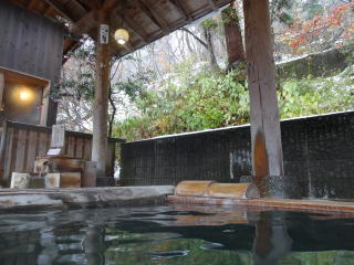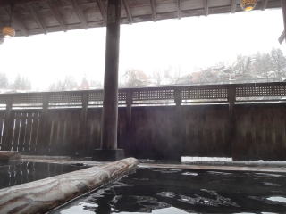 これまた姿の良い湯舟です。なんだか大相撲の土俵のよう。堂々たる浴場です。湯は源泉かけ流し。左手は名残の紅葉に雪が積もる山の斜面、右手は温泉街の屋根で、晴れた夜には月がきれいでしょう。