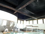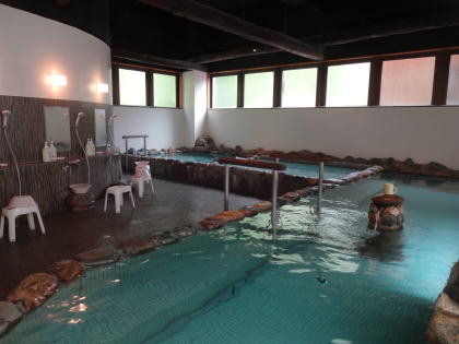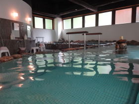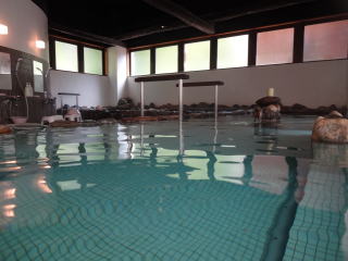 | 広々としたいい浴場です。手前が源泉かけ流しの湯舟で毎分49リットル泉温36℃弱の放射能泉が溢れています。奥が加温の湯舟で上がり湯に使います。 |