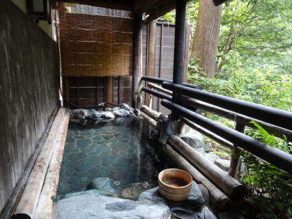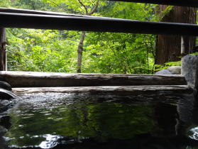 渓流を眼下に望む半露天風呂。3〜4人入れば一杯の小さな湯舟ですが、木々の緑が目に飛び込んできて気持ちいい。「うけづ」というのは対岸の山の名前だとか。
