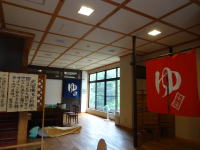 右の写真で手前の赤い暖簾が「うえの湯」、奥の青い暖簾が「おくの湯」です。HP等で紹介されている画像を見ると、うえの湯は旧温泉センター当時のいささか風情に欠ける浴場のようです。開業当時、新潟県初のクアハウスだったということで、ある意味貴重な浴場かも。 |