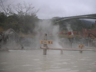 こちらが露天鉱泥湯。入り口はただの泥色をした湯という感じですが、中心部に行くにつれて足元のドロドロ感が増します。泥と言っても非常にきめが細かく、ソフトクリームのような感じ。湯温は38℃ということですが、熱保有度が高いせいでしょう。「ぬるい」という感じがしません。立入禁止区域に近づくにつれて泥の粘度も湯温も高くなります。入浴後に受付の方に伺ったのですが、火傷した人もいたそうですから、湧出付近は相当な温度だと思います。まさに「地獄」です。