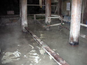 コロイド湯から露天の泥湯に行く途中にあるのが地下鉱泥湯(右写真)です。泥湯は水からの沸かし湯に比べて5倍の熱保有度があるそうで、この地下泥湯は露天よりもさらに成分が濃厚なため、小学生以下の入浴は禁じられています。泥で足を取られないように手すりが張り巡らされています。 |