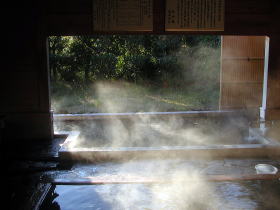湯舟に浸かっていると、植林があるため金鱗湖はほとんど見えません。裏を返せば外からも見えにくいわけで、観光名所だけにやむを得ないことでしょう。 |