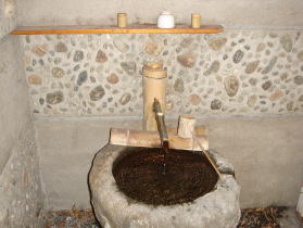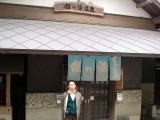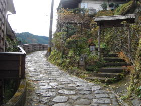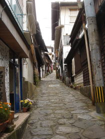 | 湯平の温泉街は花合野川(かごのがわ)に沿って細長くのびていて、石畳の坂道が延々500mにわたって続いています。この石畳が作られたのは江戸時代の享保年間(1716〜1735)だそうで、300年前の人びとと同じ石畳を歩いているのかと思うと不思議な気分です。道幅は狭く、車一台通るのがやっとです。といっても車両通行止めではないようです。 |