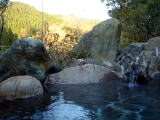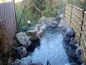 | 巧みに組まれた岩で囲まれた湯舟に自家源泉がかけ流されています。部屋の露天風呂はかなり熱いのですが、こちらは広いのでちょうどいい湯加減。柔らかな肌触りのいい湯です。 |