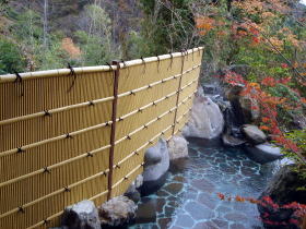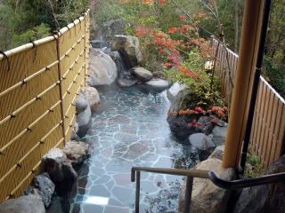 | 7〜8人がゆったり入れる広さですが、客室棟すべてに露天風呂と内湯があるので、他の人と一緒になることもなく、貸し切り状態です。紅葉がきれいでした。 |