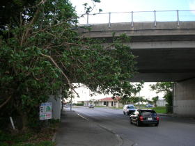 | 沖縄自動車道の高架の向こうは嘉手納基地。「US AIR FORCE」の看板を前に記念写真を撮ろうとしたら衛兵がとんできて即座に消去を求められた。 |