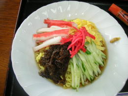 本部町の「石くびり」というそば屋で昼食。少し前にテレビ番組で紹介していた、ウコンを練り込んであるという沖縄版冷やし中華があったので、麺食いの私としては食べないわけにはいかない。