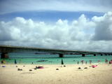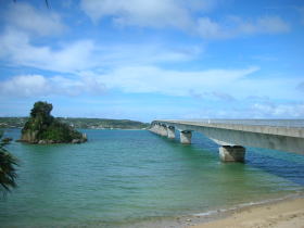 | 古宇利大橋を渡り始めるとあまりに美しい海の色に思わず声が出てしまう。周囲8kmほどの小さな島で、サトウキビ畑の広がるのどかな景色を見ながら約10分の一周ドライブを楽しめる。 |