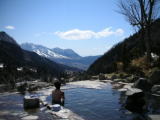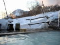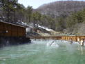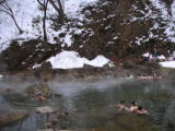 | 川床のあちらこちらから湯が湧き出している。川を堰き止めて全体が巨大な露天風呂になっている。その昔は川底を掘って入浴したそうで、「尻焼」の名は痔の治療のために川底にお尻が入るだけの穴を掘って患部を浸したことに由来する。 |