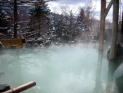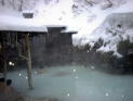 | 松川渓谷に沿って造られた細長い湯舟は20〜30人は入れる。訪れたのはまだ残雪が残る3月下旬だったが、新緑の季節、紅葉の時期、そして一面の雪景色、この露天風呂からの眺めはさぞかし素晴らしいことだろう。 |