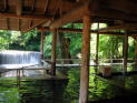 | 70畳はあるという大露天風呂。3本の樋から湯が豪快に落ちている。この他に湯舟の側面4箇所ほどから熱交換で加熱した湯も注入している。絶品のぬる湯に浸かっていると時を忘れる。混浴だが、白濁しているので女性でも安心して入ることができる。 |