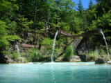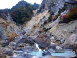 | 「おおっ」と思わず声が出てしまうくらいワイルドな露天風呂だ。荒々しいV字谷の中にあっては湯舟も人もちっぽけな存在である。左手の岩壁に6本の源泉があるそうだが、使われるのは1本だけで残りは川に流れ落ちているとか。贅沢すぎる。 |