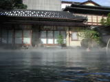 | 1909年に完成した「龍宮の湯」はとにかく広い。広さ120坪、深さ90cmという巨大露天風呂である。この広さで泉温72℃の自家源泉を循環せずにオーバーフローしている。源泉100%にこだわるこの風呂は、冬で適温だから真夏は飛び上がるほどの熱さだとか。 |