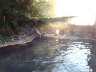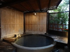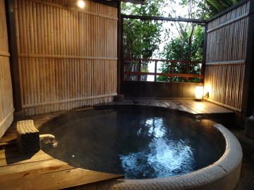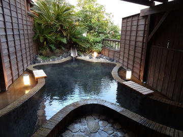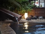 浴場は全部で6か所。男女別の大浴場、家族風呂、そして空いていればいつでも入れる無料貸切り風呂が3つあります。そのすべてが敷地内から湧き出す自家源泉をかけ流しています。 |