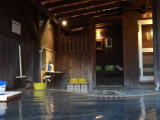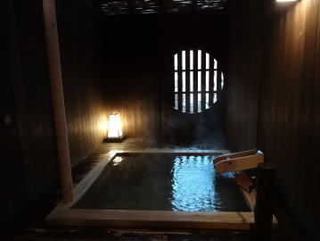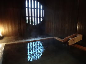 | 丸窓から光が差し込んで、雰囲気のある木の湯舟です。でも男2人ではちょっと落ち着きませんでした(笑)。 |