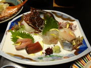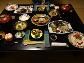 | 食事は夕食、朝食とも部屋食です(食事処もチョイスできます)。新鮮な刺身やひと手間かけた料理が並びます。量的にもちょうどよく大満足の夕食でした。 |