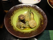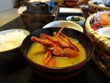 | 思わず「おっ!」と言ってしまうほどきれいな朝食。給仕も楽だろうし、この籠は素晴らしいアイディアです。昨晩刺身で出た伊勢海老も味噌汁になって2度美味しい。 |