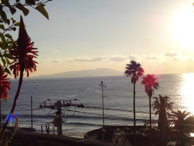 | 脱衣所から見ると「大」の字をした湯舟。5〜6人のグループでも余裕で入れる広さです。眺望抜群というわけではありませんが、板塀が切れた所からは大海原に横たう大島が見えます。 |