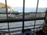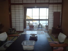 通されたのは海を見下ろす部屋。トイレは和式に後付けした洗浄付便座でこういうものもあるのかと感心しました。 |
