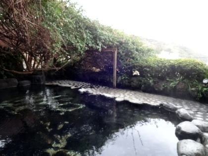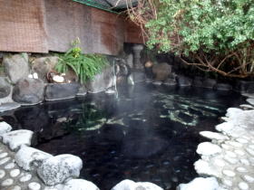 | 20人近くは入れそうな露天風呂。いかにも熱川温泉らしい熱い湯がかなりの量かけ流されていて、冬でも相当熱い。 |