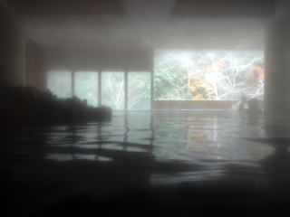 | 浴槽は3つ。左から高・中・低になっています。お湯には相当のこだわりがあって99.4℃の源泉を「竹製冷却装置」(源泉を多数の竹枝に水滴状にして伝わせ冷却する)を使って無加水でかけ流しています。素晴らしいの一語。半露天になっていて、渓流と紅葉を眺めながらゆったり入浴できます。 |