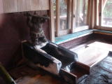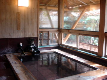 湯舟、浴室、脱衣所すべて檜造りという浴場。純和風の浴場に窓から木漏れ日が差して、花吹雪の風呂ならではの雰囲気です。