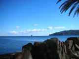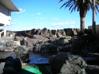 | 外には露天風呂があります。残念ながら立ち上がらないと海は見えません。 |
