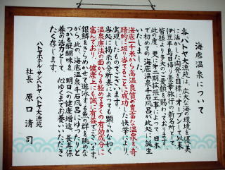 | 2012年、おやじ3人自称「温泉同好会」が稲取温泉で一夜を過ごした翌日に立ち寄ったのがここ。国道135号を通るたびに建物の壁面に掲げられた「海底温泉 日本一海底1000mより自噴」という文字が気になっていました。正確にはホテルサンハトヤに隣接するレストラン&日帰り入浴施設「ハトヤ大漁苑」の温泉施設らしい。 |