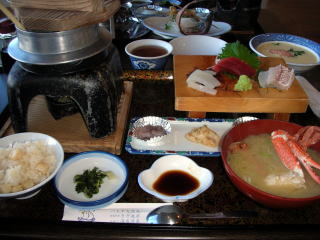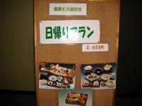 | 受付けに行くと「入浴料2,000円」也。顔を見合わせる我々3人の様子を感じ取って、受付けの女性が「食事付き入浴でお一人2,625円というプランもございますが。」 料理の写真を見たところなかなか豪勢・・・ということで入浴することに決めた次第です。 |