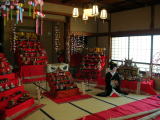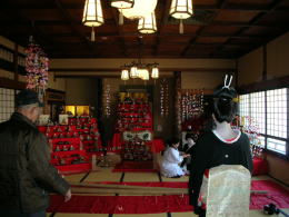 大広間には雛人形が飾られ、ちょうどお座敷文化大学の「学生さん」2人が芸者姿で記念撮影をしてもらっているところでした。 |