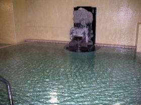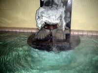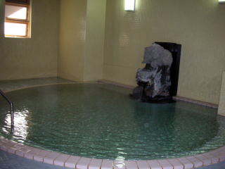 | pH8.6、アルカリ性の柔らかな湯が湯舟から溢れます。源泉温度が26.3℃のため加温していますが、かけ流しです。 |